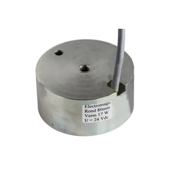 Round electro-adhesive magnet with a connection voltage of 24 VDC and a duty cycle of 100%.