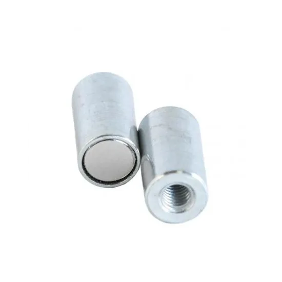 Neodymium (NdFeB) pot magnet, super powerful, with galvanized shielding and internal thread.