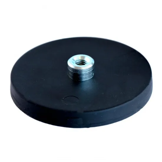 Neodymium magnet system with threaded insert, covered with black rubber, Ø 43 mm.