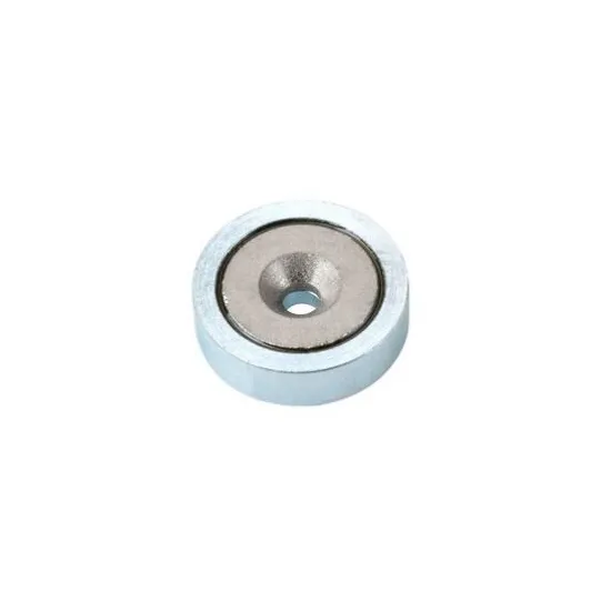 Neodymium pot magnet with continuous countersunk hole, galvanized and super powerful.