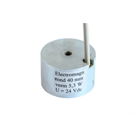 Ronde elektrokleefmagneet met een aansluitspanning van 24 VDC en een inschakelduur van 100%.