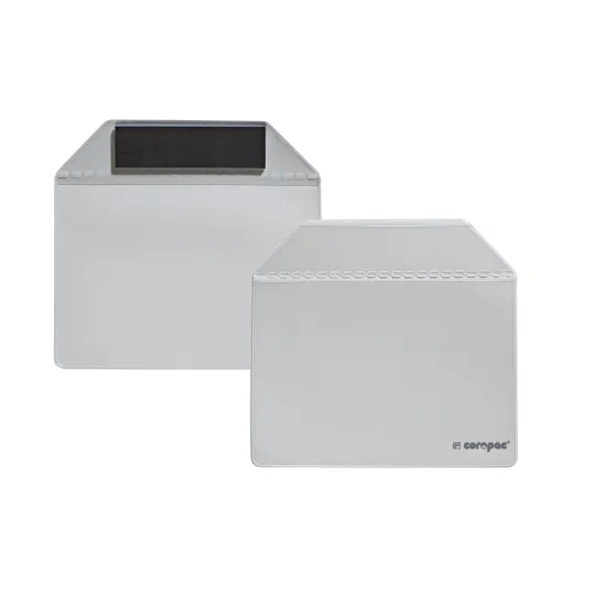 Kunstof hoes met boven aan de achterzijde een magneetstrip.